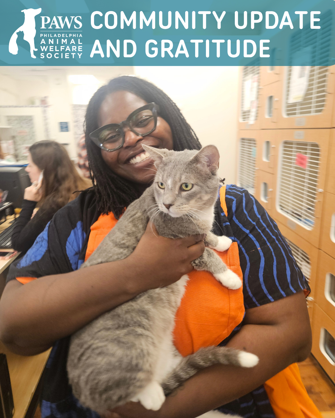 In the meantime, we’d like to reiterate how grateful we are for the outpouring of support we’ve received from the community. So many of you have reached out and stepped up in ways that mean the world to us, from volunteers transporting pets, to fosters opening their homes, to adopters welcoming new family members at a time when it’s needed most — not to mention the PAWS staff members who’ve continued to go above and beyond, including our adoption team who helped so many pets find loving homes at our Old City Adoption Center this weekend!