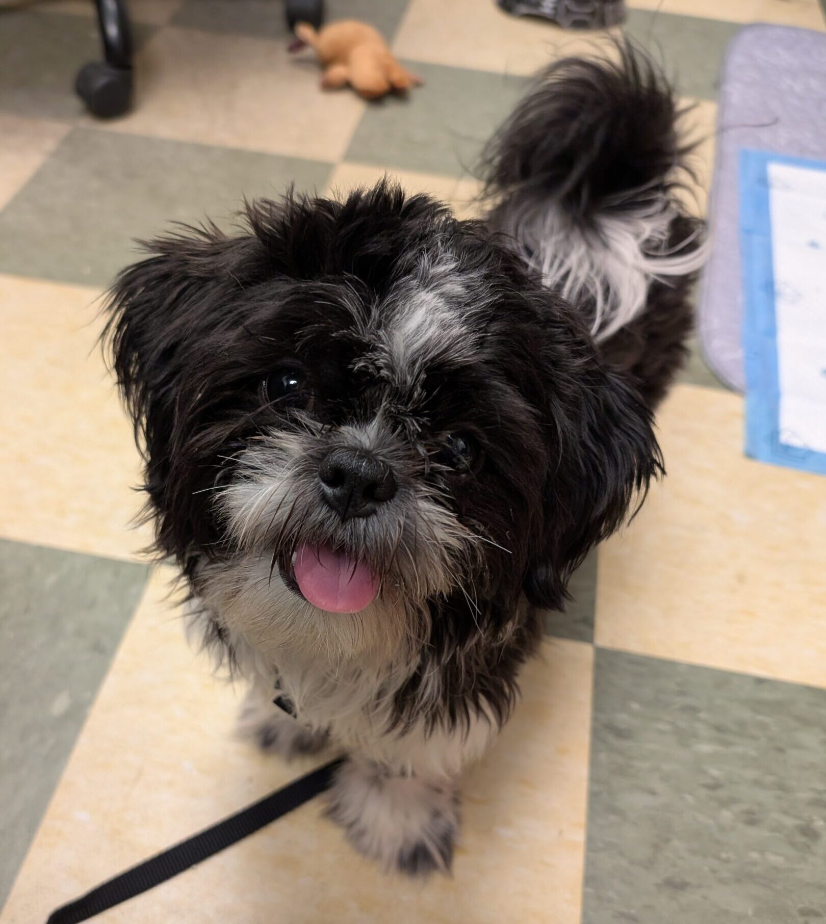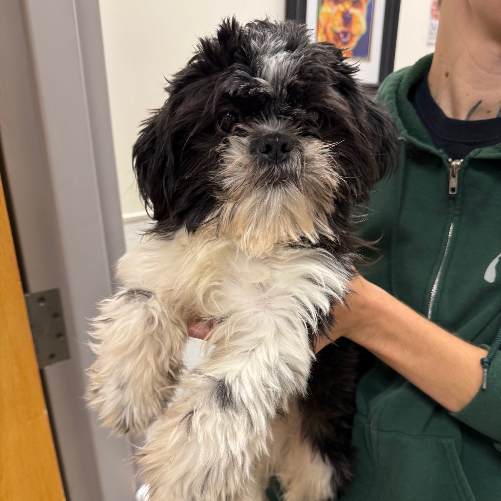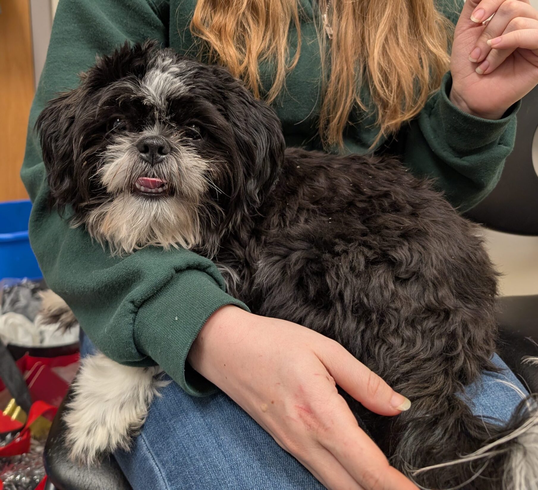 Name: Santa’s Little Helper Intake Date: 11/29/25 Age: ~8 months – 1 year old Weight: 7 lbs Dog Friendly?: Yes, and would require the ability to separate from any resident pets for slow introductions at home Cat Friendly?: Unknown, and would require the ability to separate from any resident pets for slow introductions at home