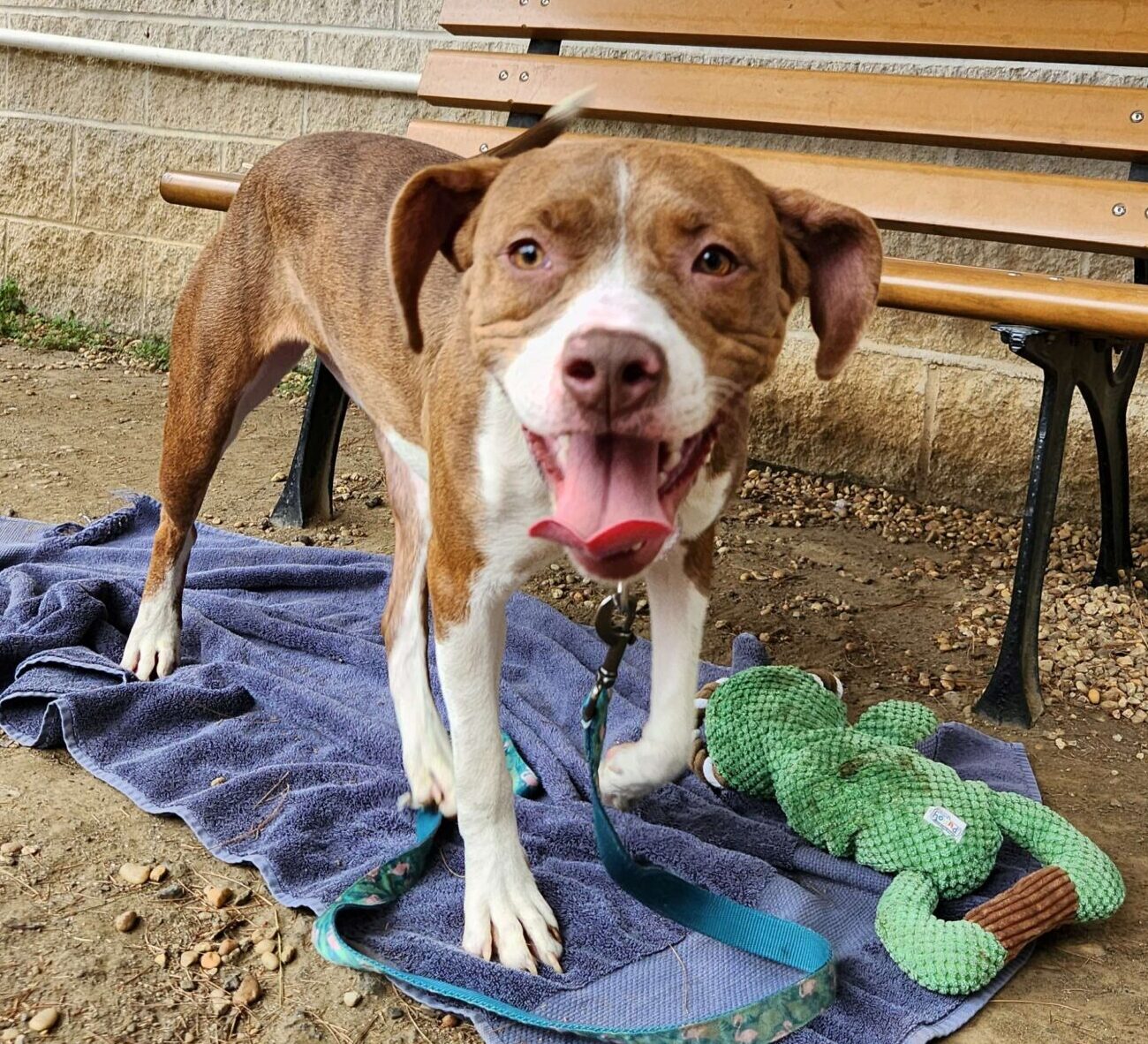 Name: Melon Intake Date: 10/12/25 Age: ~10-11 months old Weight: 40.6 lbs Dog Friendly?: Yes, and would require the ability to separate from any resident pets for slow introductions at home Cat Friendly?: Unknown, and would require the ability to separate from any resident pets for slow introductions at home