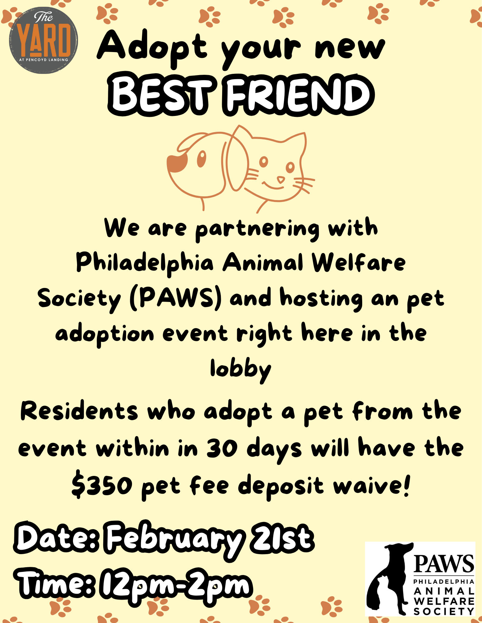 Join us for a pop-up adoption event at The Yard at Pencoyd, a riverfront community campus in Bala Cynwyd, on Saturday, February 21, from 12:00–2:00 PM.