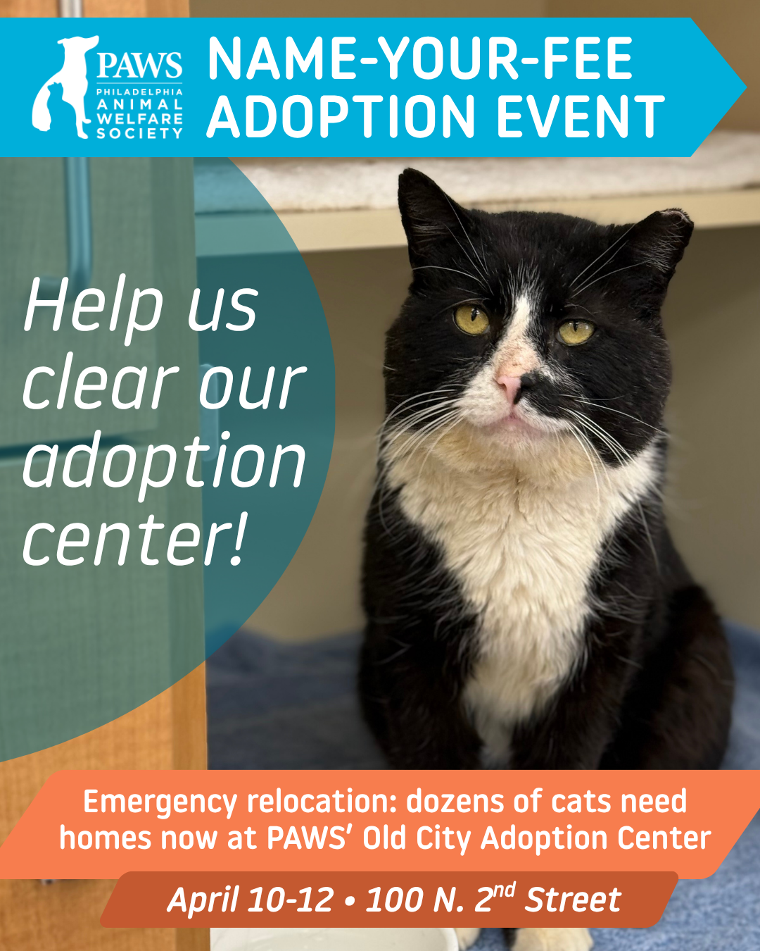 Please stop by PAWS’ Old City Adoption Center at 2nd and Arch this weekend to help move our cats into loving homes so we can save lives together. To help expedite the process, we encourage those interested to submit an adoption application prior to visiting at phillypaws.org/adopt. Our hours are: