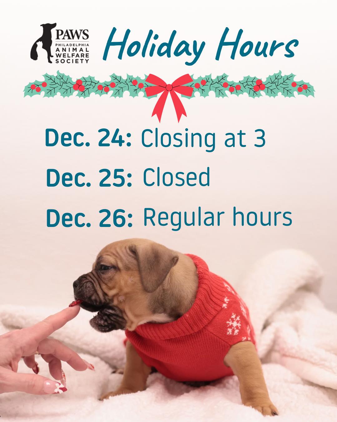 As we celebrate the holiday season, please note adjusted hours at all PAWS locations: