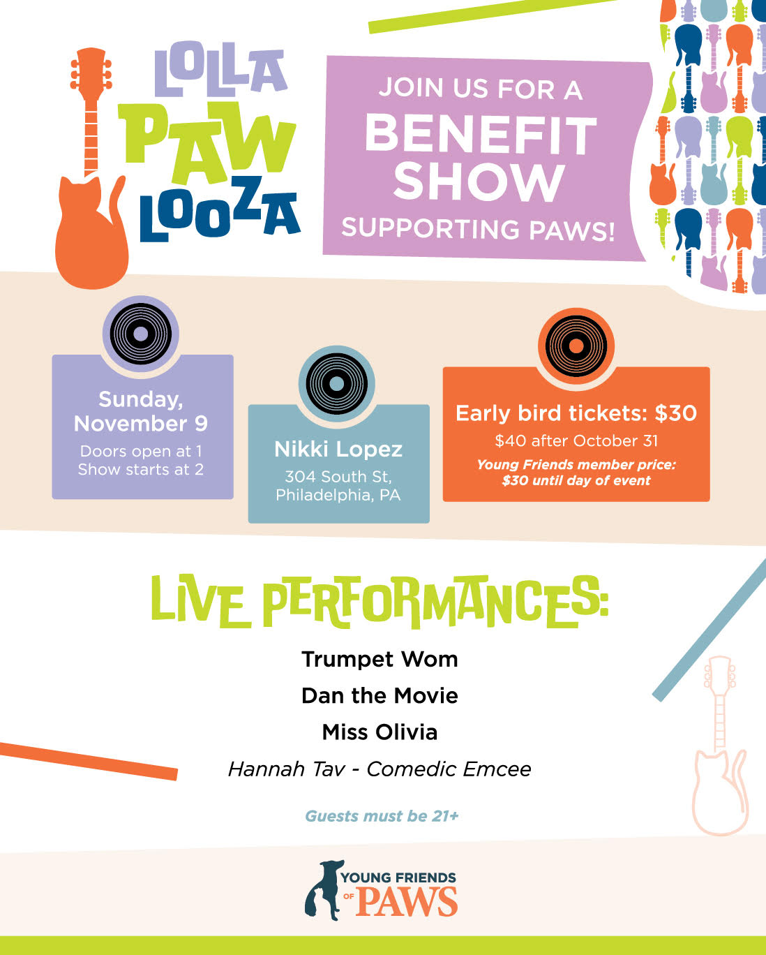Are you ready to rock n’ roll for a great cause? Join the Young Friends of PAWS for an afternoon of music at the second annual LollaPAWlooza! Philly’s favorite bands will come together for a benefit show with all proceeds supporting Philly PAWS. This uniquely fun event will take place at Nikki Lopez on Sunday, November 9. Get your tickets to LollaPAWlooza and join the fun!