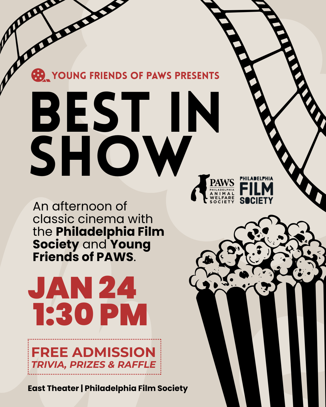 Lights, camera, paws! Join the Philly Film Society and Young Friends of PAWS for an afternoon of classic cinema and friendly competition on Saturday, January 24 at the Film Society East. Test your knowledge with animal-themed movie trivia, then settle in for a community screening of Best in Show.