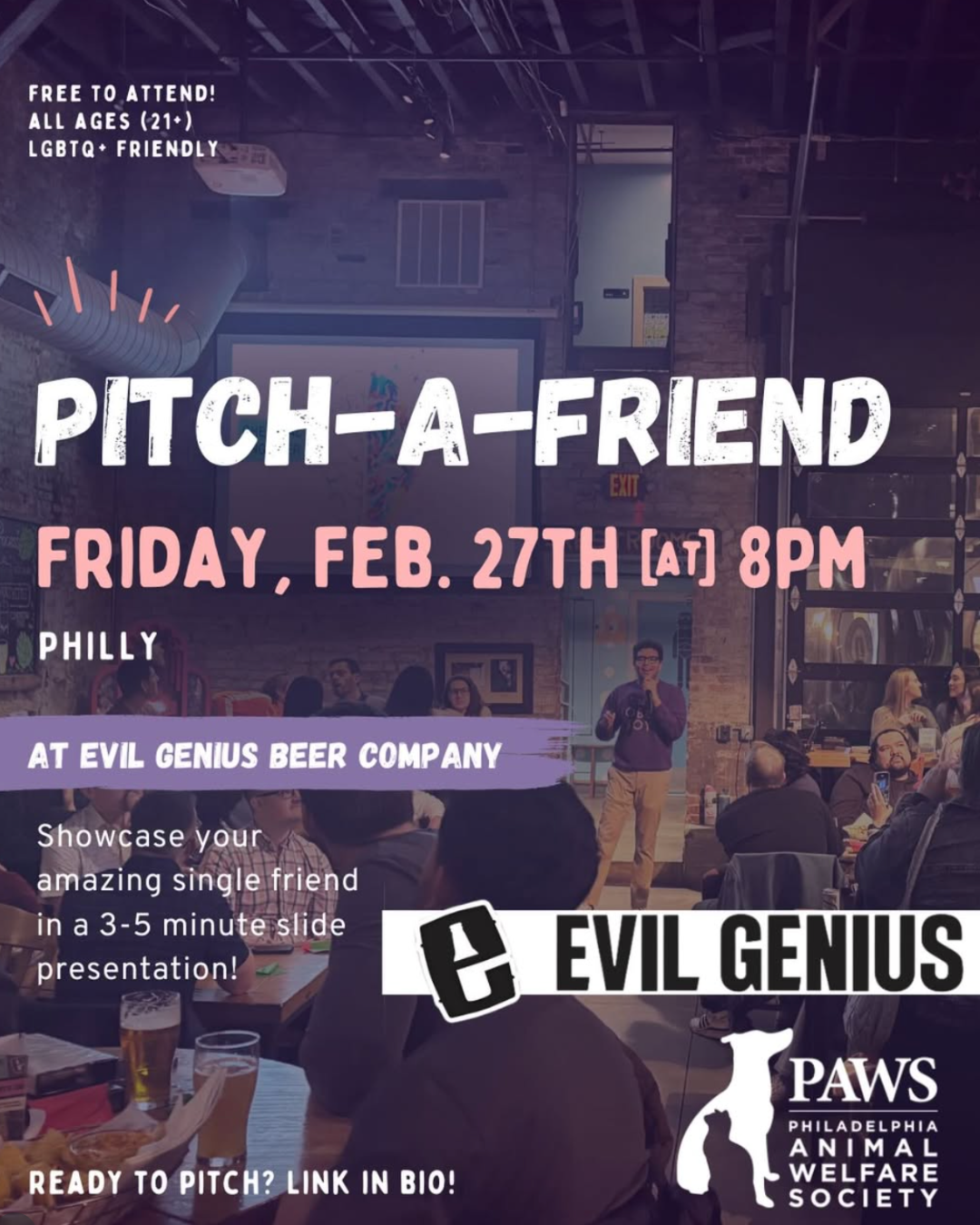 Join the Young Friends of PAWS at Evil Genius Beer Company on Friday, February 27 at 8 PM for a special Pitch-A-Friend event that puts a fun twist on matchmaking!